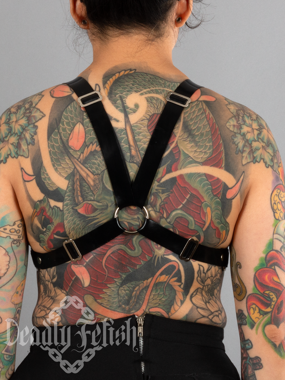 Heavy gauge latex bra with metal plate O-rings on the center of each bra cup. Buckle front and adjustable straps to achieve the perfect fit. Non underwired.