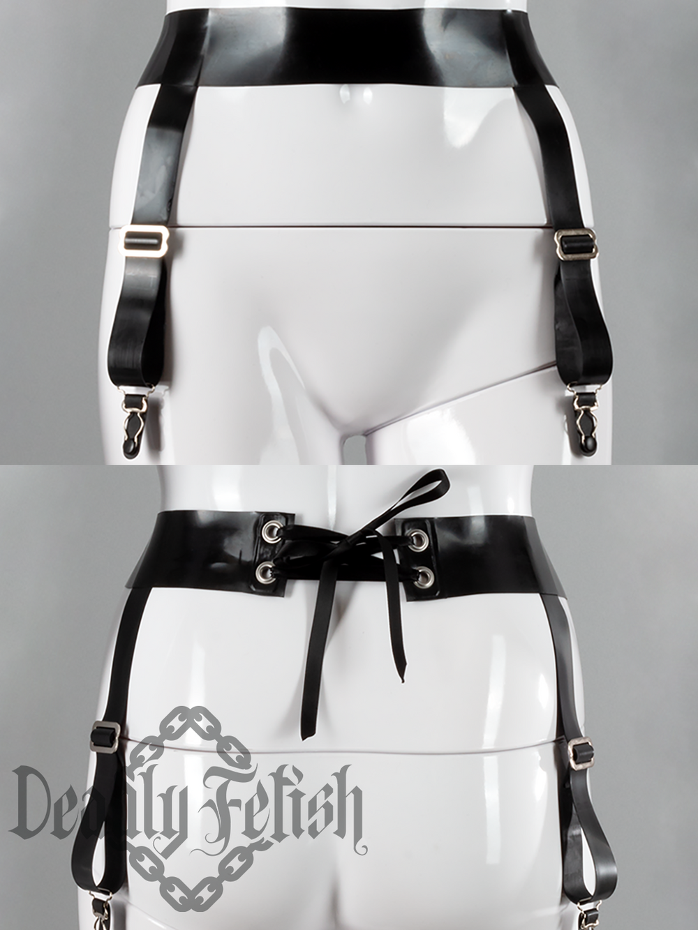 Latex 4 strap garter belt available with buckle or lace up back for adjustment. The buckle version is ideal for wearing on top of other items or on its own whereas the lace up version has a low profile for wearing under other pieces.