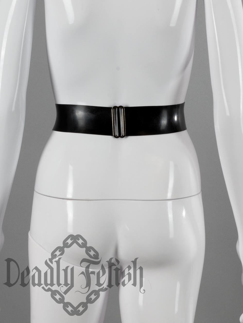 A Deadly Fetish staple, now available with a slider adjustment instead of buckle. This latex belt features a 2" wide waistband and oversized latex bow measuring approximately 9.5" across and 14.5" high. Available with contrast waistband.
