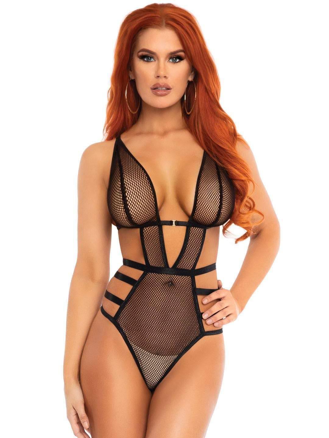 Matte Wetlook and Mesh Crotchless Bodysuit