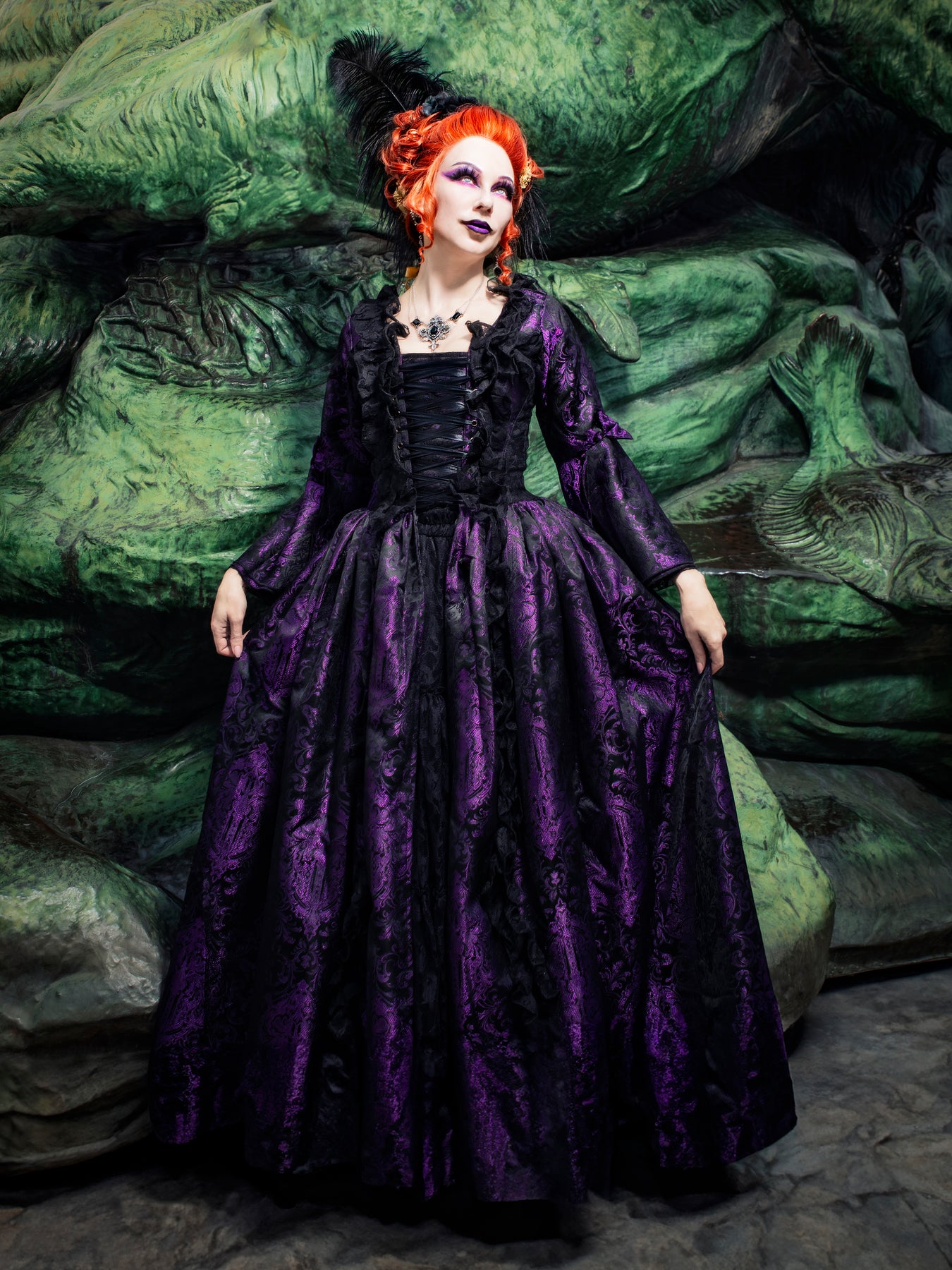 Purple brocade dress with front lacing detail, lace ruffles and trumpet sleeves. Open front skirt, pictured here layered with the Rara Maxi Skirt in lace. Fully boned with rear corset lacing and modesty panel.