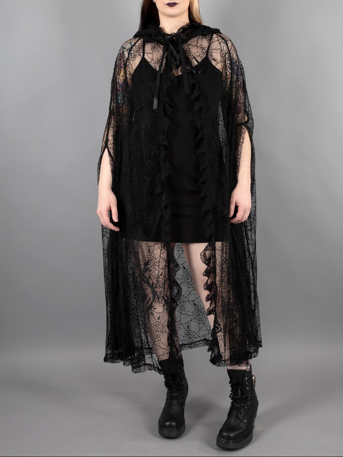 Black spiderweb lace cape features arm slits, a hood and a ruffle trim.