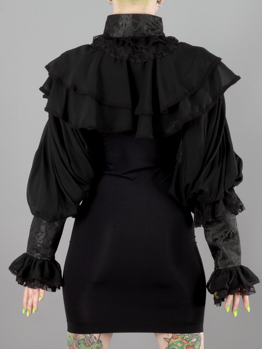 Black brocade, chiffon and lace bolero with dramatic sleeves.