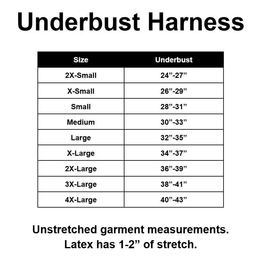 A simple and elegant style, this latex underbust harness features a detachable collar with matching dangling o-rings. Both the collar and bottom portion have a buckle closure for adjustment. Collar attaches with connector strap and can be worn on its own, or with the harness. By default sizes X-Small to Medium use a Medium centre connector strap, and sizes Large to 2X-Large use a size Large centre strap but if you need a different length please let us know in your order notes or use the contact form. For centre strap lengths above 7" we recommend using our Snap-On Buckle and Strap instead.