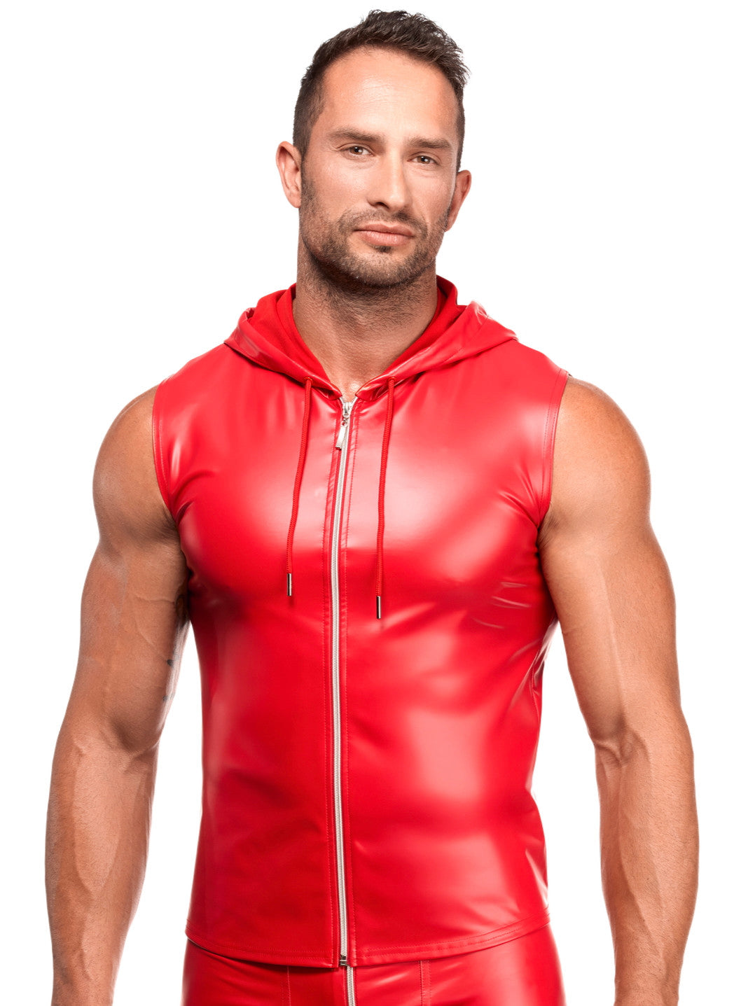 Matte wetlook zip front vest with wetlook hood.