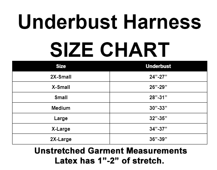 A different take on our Harness #36, this latex underbust harness features ruffle detaill along the cups, buckle closure in back and adjustable shoulder and overbust straps. D-ring on the center front is decorative but can also be used to attach onto lower harnesses with a connector strap.